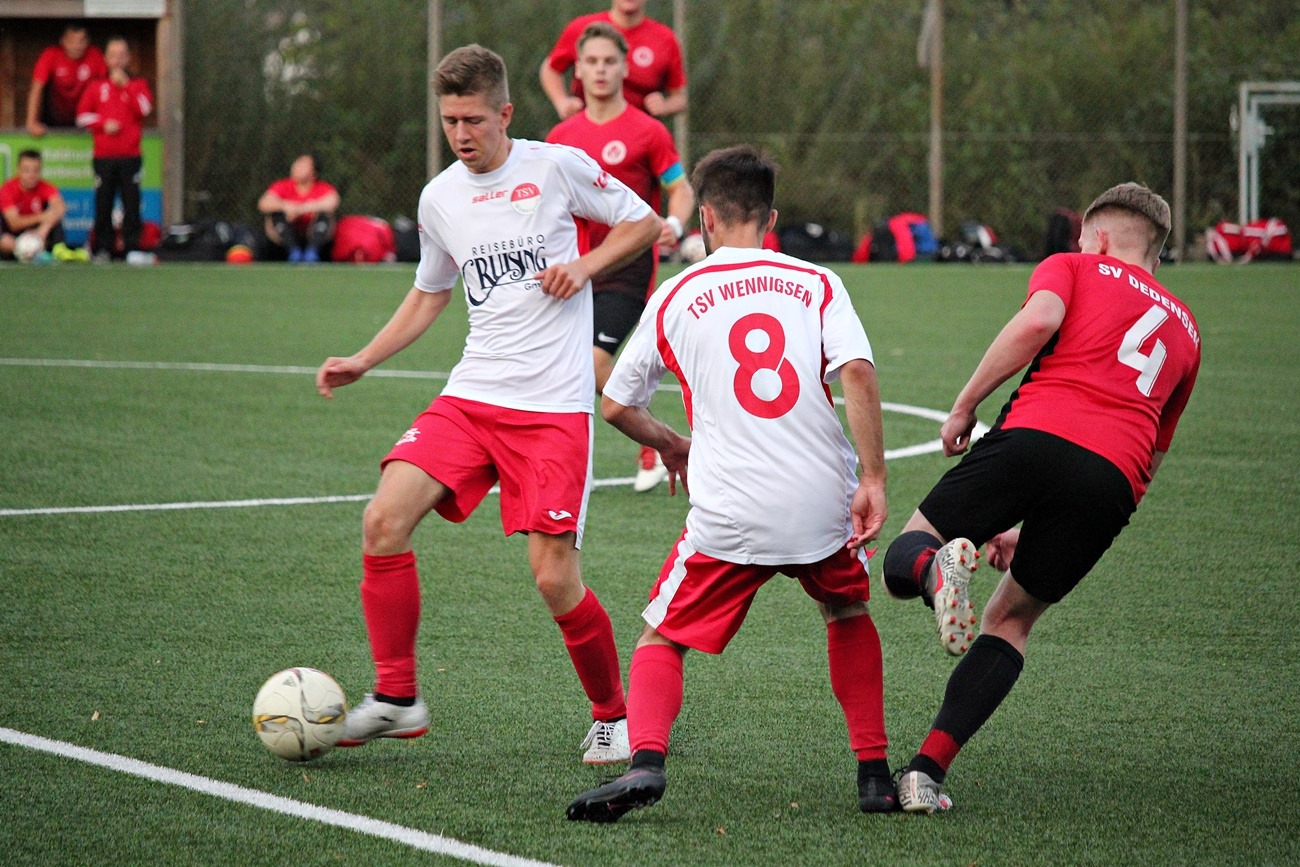 In einem kampfbetonten Spiel setzten wir uns mit 2:1 gegen Dedensen II durch. Dabei fanden die Gäste auf dem Kunstrasen zunächst besser ins Spiel. Zu viele Missverständnisse und Abstimmungsprobleme führten dazu, dass Dedensen in der ersten halben Stunde zu guten Möglichkeiten kam. Auch bei einem Strafstoß war das Glück auf unserer Seite, als der Ball vom Innenpfosten nicht den Weg ins Tor fand, sondern wieder ins Spielfeld zurückrollte. Doch auch dieser Warnschuss rüttelte die Mannschaft nicht wach. Nach einem guten Spielzug der Gäste fiel folgerichtig das 0:1. Es schien an diesem Tag einfach nichts klappen zu wollen. Doch manchmal muss man das Glück erzwingen. Dies dachte sich auch Jan-Erik Badelt, der den gegnerischen Torwart energisch anlief und angeschossen wurde. Nicht das Tor des Jahres, aber extrem wichtig für die Moral!