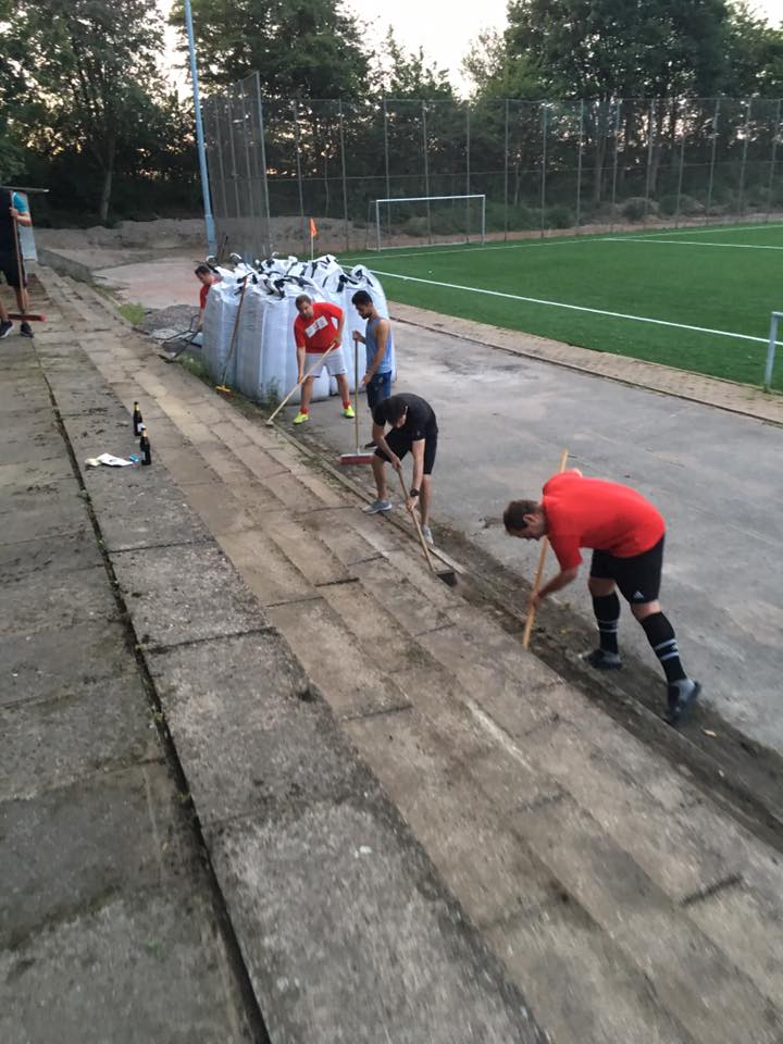 Der Weg zum Schmuckkästchen ist nicht mehr weit! Nach einer Stunde Training schuftete die 3. Herren gestern noch am hinteren Teil der Tribüne 1,5 Stunden, sodass es zum Saisonstart auch dort glänzt. Den horrenden Zuschauermassen steht einem Besuch am neuen Kunstrasenplatz nichts mehr im Wege...