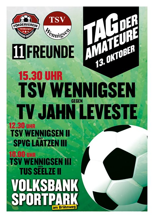Am kommenden Sonntag findet wieder die bundesweite Aktion von 11 FREUNDE statt, in dem sie den Tag der Amateure veranstalten. Wir vom TSV Wennigsen sind auch wieder mit der Partie und bieten Euch im Volksbank Sportpark drei hochinteressante Duelle an: