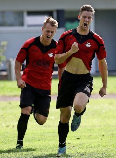 Gutes Bauchgefühl: Daniel Fetköther (vorn) jubelt mit Dennis Zbitnev über sein Tor zum 2:1: Foto: Zwing