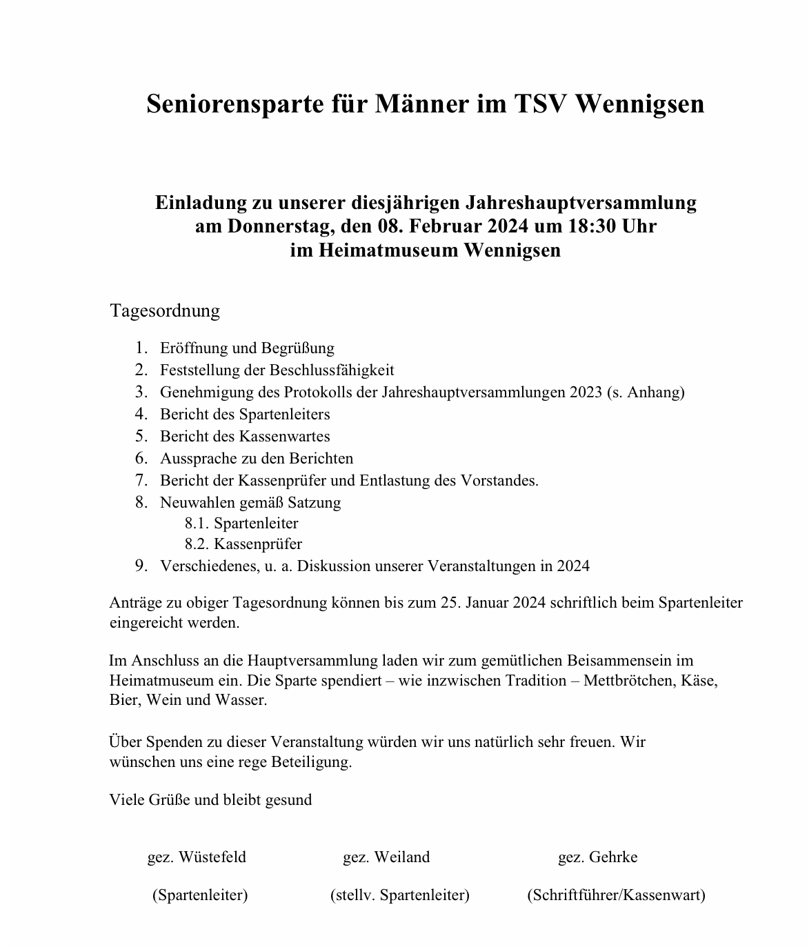 Die Sparte Männer-Seniorensport des TSV Wennigsen lädt ihre Mitglieder für Donnerstag, 08. Februar 2024 um 18:30 Uhr, zu ihrer jährlichen Hauptversammlung in das Heimatmuseum in Wennigsen ein.